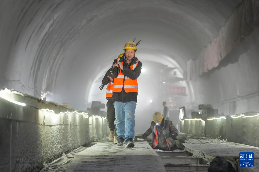 1月12日,中铁十一局集团有限公司的工作人员在雄忻高铁北太行山隧道内搬运建材。新华社记者 杨晨光 摄